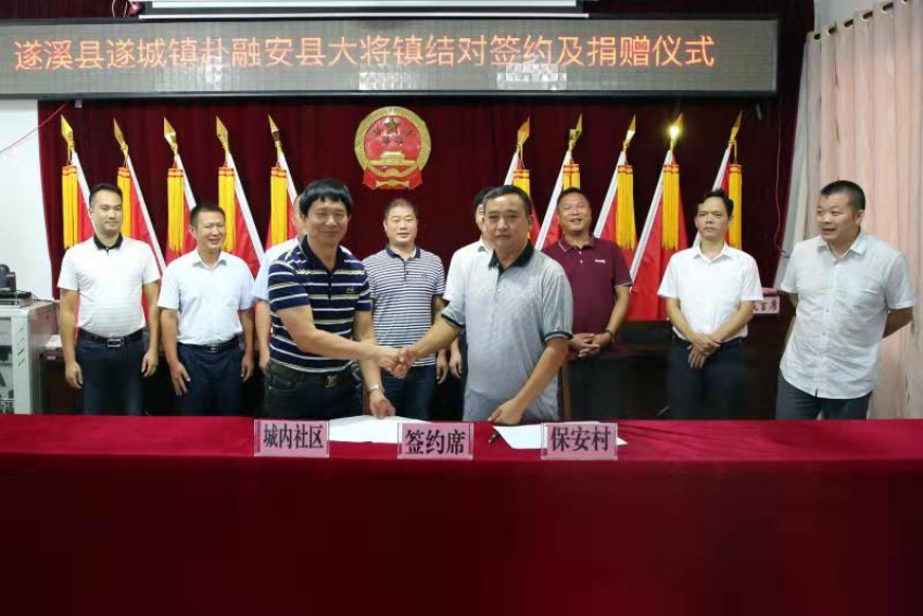 ?9月12日,在融安縣大將鎮(zhèn)舉行了扶貧協(xié)作鎮(zhèn)村結(jié)對(duì)幫扶座談會(huì),遂城鎮(zhèn)陳澤和鎮(zhèn)長、遂城鎮(zhèn)城內(nèi)社區(qū)支書廖窕權(quán)以及大將鎮(zhèn)羅財(cái)政書記、大將鎮(zhèn)保安村支書周玉健先后介紹了各自鎮(zhèn)村基本情況,雙方就脫貧攻堅(jiān)、產(chǎn)業(yè)發(fā)展、黨建工作、以及自然資源稟賦進(jìn)行了交流探討,并就下一步如何開展消費(fèi)扶貧促進(jìn)扶貧協(xié)作鎮(zhèn)村結(jié)對(duì)幫扶實(shí)效等進(jìn)行了深入討論。座談會(huì)上,遂城鎮(zhèn)與大將鎮(zhèn)、遂城鎮(zhèn)城內(nèi)社區(qū)與大將鎮(zhèn)保安村分別簽訂了結(jié)對(duì)幫扶協(xié)議,遂城鎮(zhèn)向大將鎮(zhèn)捐贈(zèng)了8萬元的幫扶資金和16輛電動(dòng)車,用于解決扶貧工作隊(duì)員進(jìn)村入戶時(shí)的交通工具問題。城內(nèi)社區(qū)向保安村捐贈(zèng)資金2萬元。??????