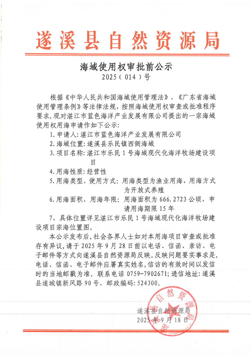 海域使用權(quán)審批前公示 2025﹝014﹞號