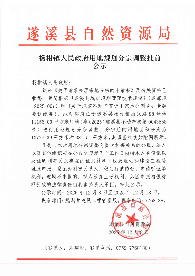 楊柑鎮(zhèn)人民政府用地規(guī)劃分宗調(diào)整批前公示