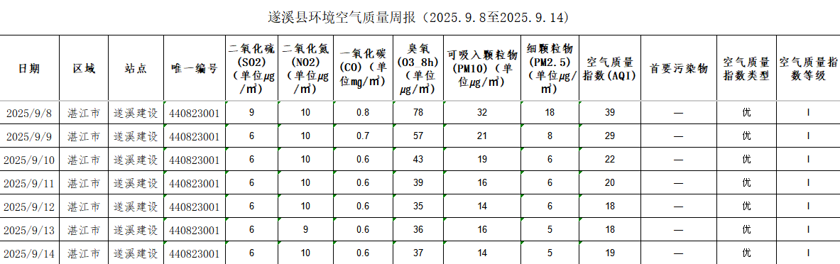 遂溪縣環(huán)境空氣質(zhì)量周報(bào)(2025.9.8至2025.9.14) | | 作者: | 來源:湛江市生態(tài)環(huán)境局遂溪分局 | 時(shí)間:2025-09-15 10:30:40 點(diǎn)擊數(shù):- 【打印正文】