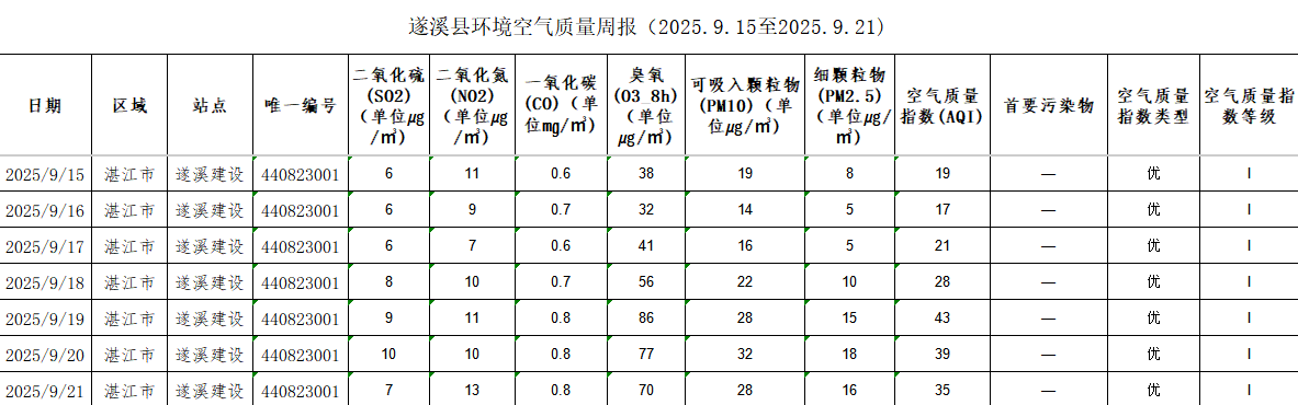 遂溪縣環(huán)境空氣質(zhì)量周報(bào)(2025.9.15至2025.9.21) | | 作者: | 來源:湛江市生態(tài)環(huán)境局遂溪分局 | 時(shí)間:2025-09-22 09:47:39 點(diǎn)擊數(shù):- 【打印正文】