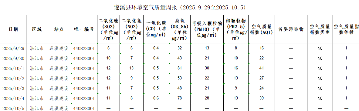 遂溪縣環(huán)境空氣質量周報(2025.9.29至2025.10.5) | | 作者: | 來源:湛江市生態(tài)環(huán)境局遂溪分局 | 時間:2025-10-05 09:49:36 點擊數(shù):- 【打印正文】