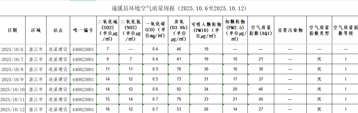 遂溪縣環(huán)境空氣質量周報(2025.10.6至2025.10.12) | | 作者: | 來源:湛江市生態(tài)環(huán)境局遂溪分局 | 時間:2025-10-13 09:50:40 點擊數:- 【打印正文】