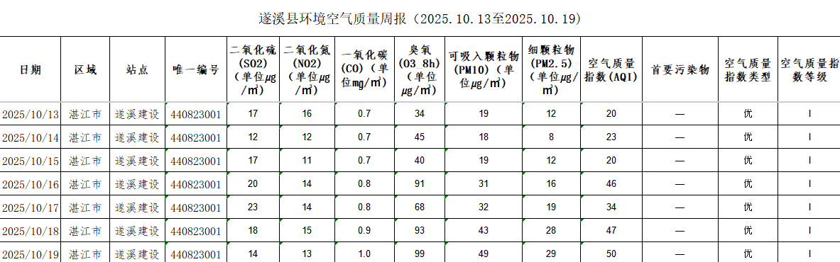 遂溪縣環(huán)境空氣質(zhì)量周報(2025.10.13至2025.10.19) | | 作者: | 來源:湛江市生態(tài)環(huán)境局遂溪分局 | 時間:2025-10-20 09:49:35 點(diǎn)擊數(shù):- 【打印正文】