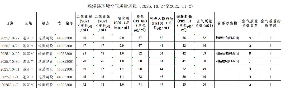 遂溪縣環(huán)境空氣質(zhì)量周報(2025.10.27至2025.11.2) | | 作者: | 來源:湛江市生態(tài)環(huán)境局遂溪分局 | 時間:2025-11-04 09:00:03 點擊數(shù):- 【打印正文】