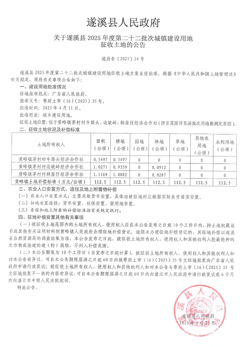 遂溪縣人民政府 關于遂溪縣2025年度第二十二批次城鎮(zhèn)建設用地征收土地的公告 遂府告〔2025〕14號 | | 作者: | 來源:遂溪縣人民政府 | 時間:2025-04-23 17:21:29 點擊數(shù):- 【打印正文】