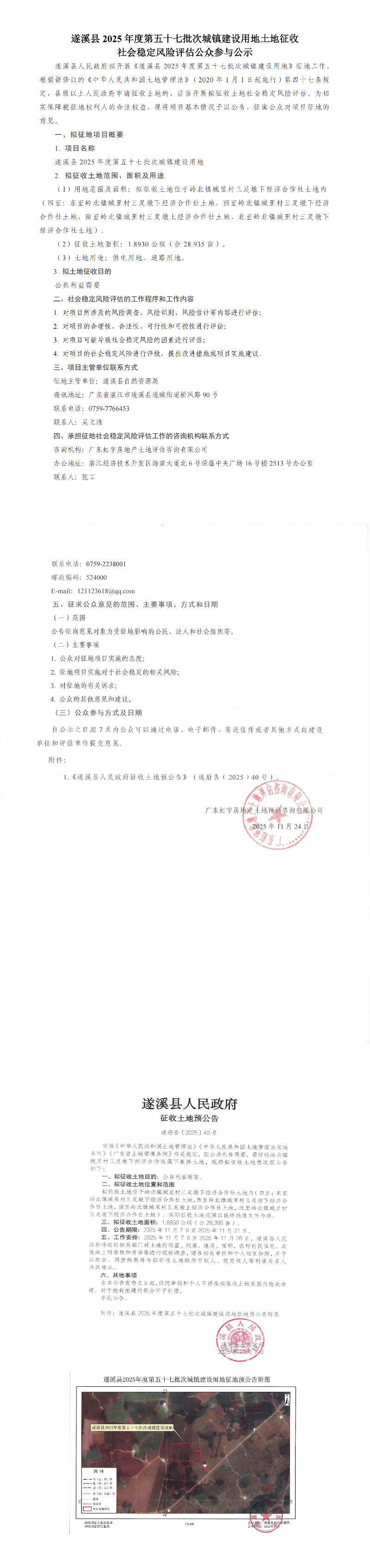 遂溪縣2025年度第五十七批次城鎮(zhèn)建設(shè)用地土地征收社會穩(wěn)定風險評估公眾參與公示 | | 作者: | 來源:遂溪縣自然資源局 | 時間:2025-11-24 15:52:55 點擊數(shù):- 【打印正文】