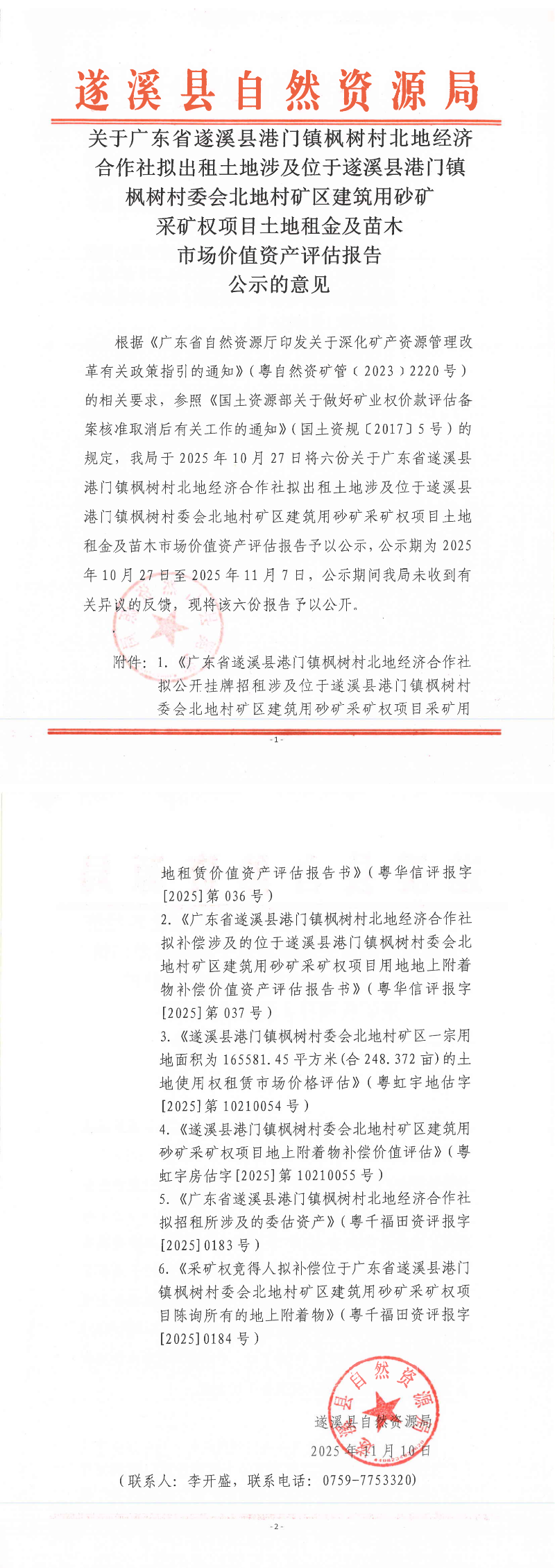 關(guān)于廣東省遂溪縣港門鎮(zhèn)楓樹村北地經(jīng)濟(jì)合作社擬出租土地涉及位于遂溪縣港門鎮(zhèn)楓樹村委會(huì)北地村礦區(qū)建筑用砂礦采礦權(quán)項(xiàng)目土地租金及苗木市場價(jià)值資產(chǎn)評估報(bào)告公示的意見 | | 作者: | 來源:遂溪縣自然資源局 | 時(shí)間:2025-11-10 16:13:43 點(diǎn)擊數(shù):- 附件: 1.《廣東省遂溪縣港門鎮(zhèn)楓樹村北地經(jīng)濟(jì)合作社擬公開掛牌招租涉及位于遂溪縣港門鎮(zhèn)楓樹村委會(huì)北地村礦區(qū)建筑用砂礦采礦權(quán)項(xiàng)目采礦用地租賃價(jià)值資產(chǎn)評估報(bào)告書》粵華信評報(bào)字[2025]第036號.pdf 2.《廣東省遂溪縣港門鎮(zhèn)楓樹村北地經(jīng)濟(jì)合作社擬補(bǔ)償涉及的位于遂溪縣港門鎮(zhèn)楓樹村委會(huì)北地村礦區(qū)建筑用砂礦采礦權(quán)項(xiàng)目用地地上附著物補(bǔ)償價(jià)值資產(chǎn)評估報(bào)告書》(粵華信評報(bào)字[2025]第037號).pdf 3.《遂溪縣港門鎮(zhèn)楓樹村委會(huì)北地村礦區(qū)一宗用地面積為165581.45平方米(合248.372畝)的土地使用權(quán)租賃市場價(jià)格評估》(粵虹宇地估字[2025]第10210054號).pdf 4.《遂溪縣港門鎮(zhèn)楓樹村委會(huì)北地村礦區(qū)建筑用砂礦采礦權(quán)項(xiàng)目地上附著物補(bǔ)償價(jià)值評估》(粵虹宇房估字[2025]第10210055號).pdf 5.《廣東省遂溪縣港門鎮(zhèn)楓樹村北地經(jīng)濟(jì)合作社擬招租所涉及的委估資產(chǎn)》(粵千福田資評報(bào)字[2025]0183號).pdf 6.《采礦權(quán)競得人擬補(bǔ)償位于廣東省遂溪縣港門鎮(zhèn)楓樹村委會(huì)北地村礦區(qū)建筑用砂礦采礦權(quán)項(xiàng)目陳詢所有的地上附著物》(粵千福田資評報(bào)字[2025]0184號).pdf 【打印正文】