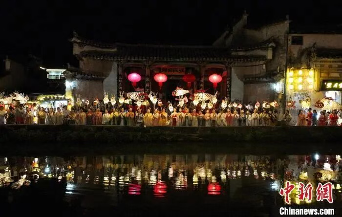 資料圖:安徽省黃山市黟縣宏村舉行“花燈邀明月 歡樂(lè)度中秋”花燈游園會(huì),人們舞動(dòng)繽紛多彩的花燈漫步在古村中,邂逅良辰美景,在燈火月影中感受傳統(tǒng)文化魅力,喜迎中秋佳節(jié)。(無(wú)人機(jī)照片)施亞磊 攝