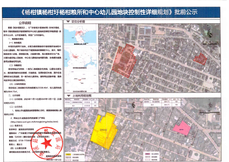 《楊柑鎮(zhèn)楊柑圩楊柑糧所和中心幼兒園地塊控制性詳細(xì)規(guī)劃》批前公示 | | 作者: | 來(lái)源:遂溪縣自然資源局 | 時(shí)間:2025年-11月-12日 點(diǎn)擊數(shù) 分享到: 【打印正文】