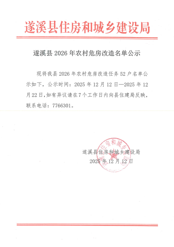 遂溪縣2026年農(nóng)村危房改造名單公示 | | 作者: | 來源:本網(wǎng) | 時間:2025-12-12 11:08:17 點擊數(shù):- 遂溪縣2026年農(nóng)村危房改造名單公示.pdf 【打印正文】